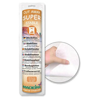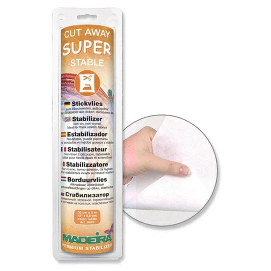 Iron on / cut away embroidery stabilizer for thick stretch fabrics Madiera Super Stable is great for machine embroidery and appliqué as it remains on the fabric to keep it stable during and after embroidery. Iron in place stitch, and carefully cut away excess backing close to stitching.